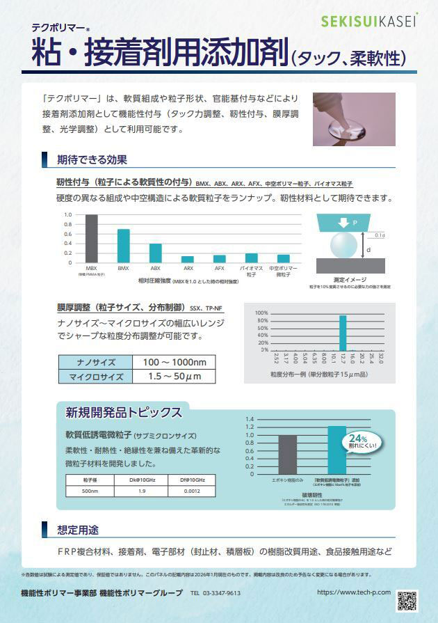 「テクポリマー」は、軟質組成や粒子形状、官能基付与などにより、
