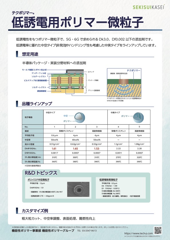 低誘電性をもつポリマー微粒子で、5G・6G で求められる Dk3.0、Df0.002 以下の添加剤です。
