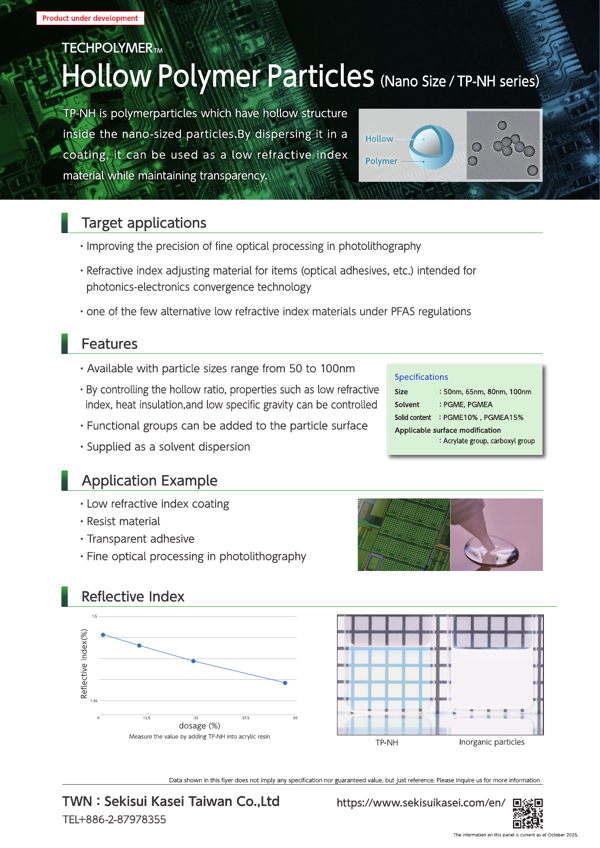 NH series is polymer particles which have hollow structure inside the nano-sized particles. By dispersing it in a coating, it can be used as a low refractive index material while maintaining transparency.