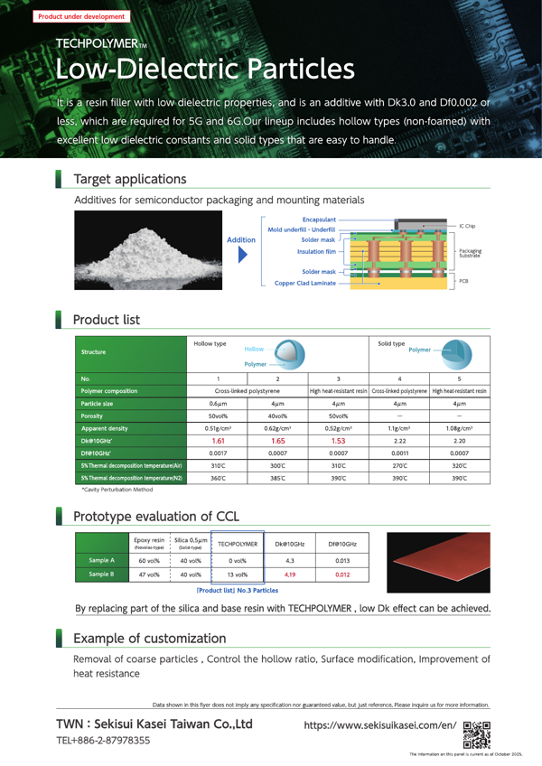 It is a resin filler with low dielectric properties, and is an additive with Dk3.0 and Df0.002 or less, which are required for 5G and 6G. Our lineup includes hollow types (non-foamed) with excellent low dielectric constants and solid types that are easy to handle.